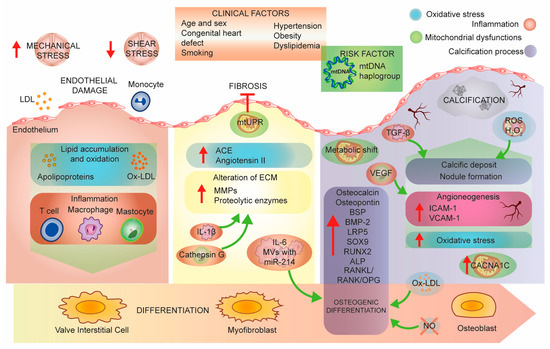 Aortic stenosis pathobiology: a molecular perspective. Mechanical and shear stress induces endothelial damage that leads to lipid accumulation and increased inflammation in valve tissue. These physiological impairments lead to fibrotic processes and to a step-by-step differentiation of valve interstitial cells to myofibroblasts and finally osteoblasts. The final stage of the disease is the calcification of the tissue. Abbreviations: LDL, low-density lipoprotein; oxLDL, oxidized low-density lipoprotein; mtUPR, mitochondrial unfolded protein response; ACE, angiotensin-converting enzyme; ECM, extracellular matrix; MMPs, matrix metalloproteinases; MVs, microvesicles; TNF-α, tumor necrosis factor α; BSP, bone sialoprotein; BMP-2, bone morphogenetic protein-2; LRP5, LDL receptor-related protein 5; SOX9, SRY-box 9; RUNX2, runt-related transcription factor 2; ALP, alkaline phosphatase; RANKL, receptor activator of NF-kappa B ligand; RANK, receptor activator of nuclear factor κ; OPG, osteoprotegerin; NO, nitric oxide; VEGF, vascular endothelial growth factor; TGF-β, transforming growth factor beta; ROS, reactive oxygen species; ICAM-1, intercellular adhesion molecule 1; VCAM-1, vascular cell adhesion molecule-1; CACNA1C, calcium voltage-gated channel subunit alpha 1 C.