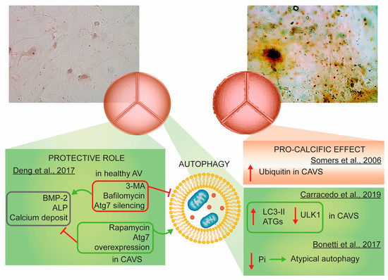 Conversely, in 2017, a study performed in HAVICs from normal donors and donors with calcification reported significantly higher autophagic activity in healthy leaflets than in CAVS. Modulation of autophagy by the use of the inhibitor 3-methyladenine (3-MA) and the activator rapamycin highlighted the protective role of autophagy in inhibiting BMP and ALP expression and calcium deposits. Thus, autophagy inhibits pro-osteogenic activity in HAVICs [144]. This work shows discrepancies with that of Somers et al. [143]. This could be related to the use of different markers of autophagy and ubiquitin detection in the whole tissue versus LC3 evaluation in living cells.