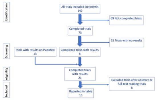 More than 140 trials are available on trials.gov. Among these, major contribution of lactoferrin has been demonstrated on anaemia, bacterial and viral infection, both communitarian and nosocomial, inflammation and prevention of sepsis. (Table 1). These trials assessed the safety, tolerability, efficacy of Lf both as an oral dietary supplement or as an intranasal spray. We performed a comprehensive search on US National Institutes of Health Ongoing Trials Register, using the word “lactoferrin”. The first result included 142 trials. Then, we included only “completed trials”, which gave 73. Among these 73, trials, we selected eight trials with results. In order to include results not available on US National Institutes of Health Ongoing Trials Register, we performed a cross-research on PubMed using the NTC number. This has permitted us to include another 13 completed trials with results. Among these 21 trials, eight were excluded as not pertinent to our review, analysing other drugs. Overall, 13 completed trials with results are included in the table. All human studies were included with no restrictions on age, sex, ethnicity or type of study. Trials with no results were excluded. Analyses also excluded animal studies. (Figure 1).