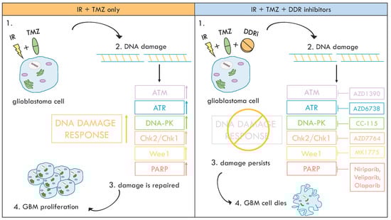 Treatment of cancerous cells with the standard combination of ionizing radiation (IR) and temozolomide (TMZ) causes DNA damage and subsequent activation of the DNA damage response (DDR) kinases (i.e., ATM, ATR and DNA-PK). Over-activation of such proteins is frequent in cancers and is responsible for therapy resistance. Addition of a DDR inhibitor to standard therapy helps reduce DNA repair rate and increases the mortality of tumor cells. Inhibitors shown in the graphic are currently been tested for glioblastoma multiforme (GBM) treatment. IR, ionizing radiation; TMZ, temozolomide.
