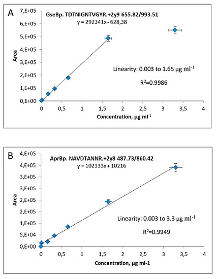 A calibration curve using a highly intense transition for each target protein is vital for accurate protein quantification by MRM analysis. For this purpose, purified serine proteases with a degrees of protein purity of 757.11 for AprBp and 1257 for GseBp, were used to construct the calibration curve, basing on a range that us suitable for the protein concentration in the samples [21,22]. Purified enzymes (AprBp and GseBp) were added to the gel and separated via a one-dimensional SDS-PAGE. protein bands corresponding to proteases were cut from the gel and enzymatic digestion was performed. Extracted peptides were dissolved in a concentration of 3.3 μg mL−1 protein, which was taken as the maximal point on the calibration curve. A serial dilution from 0.0033 µg mL−1 to 3.3 µg mL−1 was prepared. The calibration plot for the TDTNIGNTVGYR+2y9 transition exhibited linearity of up to 1.65 µg mL−1 for GseBp protease with a lower limit of quantification at 0.003 µg mL−1 (Figure 2A). The NAVDTANNR+2y8 transition of AprBp exhibited linearity of up to 3.3 µg mL−1 with a lower limit of quantification at 0.0033 µg mL−1 (Figure 2B).