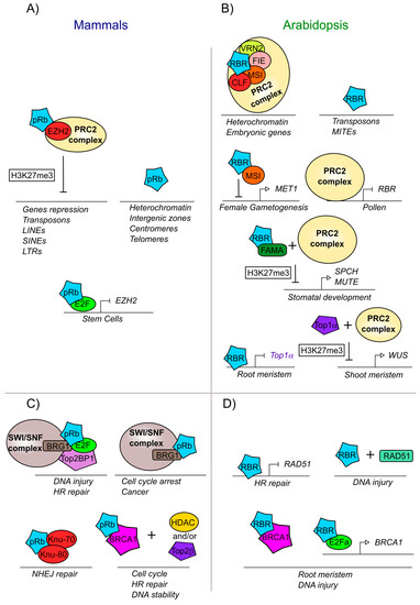 - Biedermann, S.; Harashima, H.; Chen, P.; Heese, M.; Bouyer, D.; Sofroni, K.; Schnittger, A. The retinoblastoma homolog RBR 1 mediates localization of the repair protein RAD 51 to DNA lesions in Arabidopsis. EMBO J. 2017, 36, 1279–1297. [Google Scholar] [CrossRef] [PubMed]