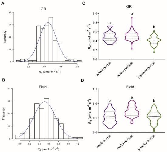 Natural variation of dark respiration (Rd) in 206 rice lines in a global rice minicore diversity panel. (A,B) Histogram of Rd under growth room (GR) and field conditions, respectively. (C,D) Frequency distribution of observed Rd under GR and field, respectively. indica includes Australica (AUS) and indica (IND); while, japonica encompasses temperate japonica (TEJ), tropical japonica (TRJ) and aromatic (ARO). Admix represents a mixture of indica and japonica. Different letters are significantly different at 5% level among subpopulations with the Tukey test.