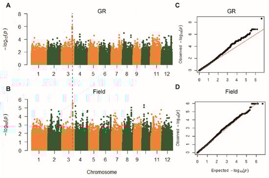 Genome-wide association study (GWAS) performed on the Rd trait under GR and field conditions. (A,B) Manhattan plots from the associate mapping of Rd using a linear mixed model (MLM) in GR and field, respectively. (C,D) QQ plots of expected versus observed P-values of Rd in GR and field, consecutively. The vertical dashed-line crossing both Manhattan plots at Chr.3 represents the overlapped genomic regions of significantly associated SNPs for both conditions (GR and field).