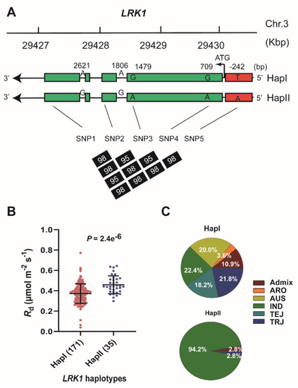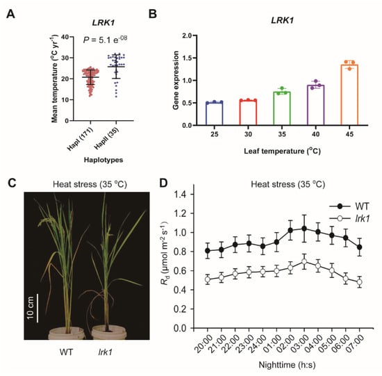 In addition to light, we also corroborated the temperature dependency of the LRK1 function in rice plants. It is well-known that plant respiration is mostly influenced by temperature [45]. Hence, increasing the air temperature causes a substantial increase in the respiratory fluxes at both the leaf and canopy scales [46]. This temperature dependency of respiration might potentially be related to the LRK1 biological function. Here, we showed that the expression of LRK1 is increased with increasing the temperature treatment for 30 min each (Figure 6B). Furthermore, the HapII of LRK1, which is associated with higher LRK1 gene expression, mainly exists in the regions characterized by their higher average temperature than lines harboring the HapI (Figure 6A). Altogether, this implies that the temperature can regulate the LRK1 expression levels, and hence, influence the Rd.