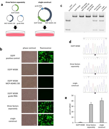 To determine the editing efficiency, Sanger sequencing of RT-PCR products was performed (Figure 1d), and the editing efficiency was calculated from the peak height ratio []. At 48 h after transfecting the three factors separately, the editing efficiency was 34%, compared with 41% when transfecting with a single construct (Figure 1e).