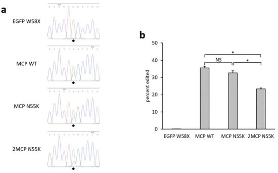 These three MCPs (MCP WT, MCP N55K, and 2MCP N55K) were compared using single constructs. The editing efficiencies of MCP WT, MCP N55K, and 2MCP N55K after 48 h were 35%, 33%, and 23%, respectively (Figure 2a,b).