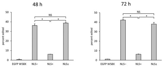 Bar graphs showing the editing efficiency (%) at 48 h (left) or 72 h (right) after transfection, calculated from the sequencing results using the peak height ratio method. Error bars represent standard error (n = 3). Asterisks indicate statistically significant differences (p < 0.05). NS (not significant) signifies no statistically significant difference.