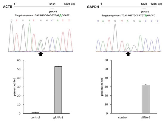 ACTB (left) and GAPDH (right) targeted base (green), the waveform data around the target site and bar graphs indicating the editing efficiencies. Black arrows indicate the target base for each gene. Error bars represent standard error (n = 3).