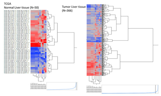 Hierarchical clustering plot (heatmap) of the let-7 miRNA family expression in healthy (n = 50) and tumor (n = 366) liver tissue samples obtained from TCGA-LIHC.
