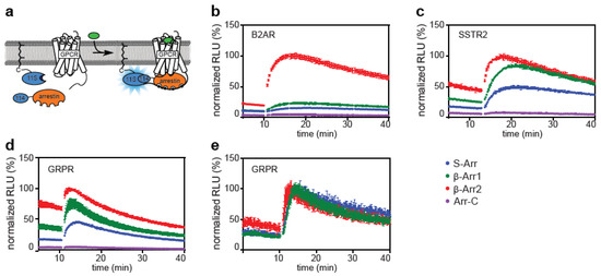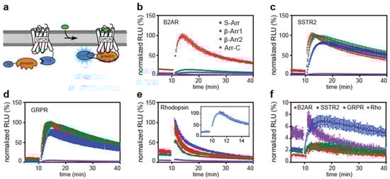Nanoluc enzyme complementation was previously used to measure β-arrestin-2 recruitment to B2AR and vasopressin receptors. This assay is based on β-arrestin-2 that is modified at its N-terminus with the small subunit of NanoLuc (114) and a GPCR with the large subunit (11S) at the C-terminus [29]. We expanded this strategy by using all four human arrestins (Figure 1). We fused the NanoLuc subunits using flexible glycine-serine linkers of 14 and 16 amino acids for arrestins and GPCRs, respectively. We verified the function of the assay using several GPCRs: the B2AR as a prototypical class A receptor that preferentially binds β-arrestin-2, gastrin-releasing peptide receptor (GRPR) and somatostatin receptor type 2 (SSTR2) as examples of peptide receptors, and human rhodopsin (hRho), one of the best-studied light-sensitive receptors. We detected recruitment of all four arrestins to all tested GPCRs upon ligand stimulation, suggesting that our arrestin probes are able to distinguish between the active and inactive state of all tested GPCRs. The B2AR showed a strong selectivity for β-arrestin-2 over all other arrestins, as was expected from its class A nature (Figure 1b) [30]. GRPR and SSTR2 showed binding of both β-arrestins, indicative of a class B behavior. In addition, they recruited S-arrestin (Figure 1c,d). Rhodopsin was stimulated with light flashes and showed a strong interaction with its native binding partner S-arrestin (Figure 1e) as well as both β-arrestins. Arrestin-C consistently generated weak signals, both before and after stimulation of the receptor (Figure 1f). This may be due to low affinity of arrestin-C for the tested GPCRs or low expression of the construct.
