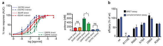 Comparison of different arrestin recruitment assays. (a) β-arrestin-2 recruitment was measured for B2AR, GRPR and SSTR2 stimulated with different concentrations of their respective agonist in both the direct and indirect assay approach. Dose response was determined by calculating the area under the curve (AUC) from the time point of agonist addition to the end of the experiment. All responses were normalized to the maximum response generated by each receptor. Data from three independent experiments ±SEM are shown. Potency was calculated from dose–response curves for each assay type using a four-parameter nonlinear regression and compared using an unpaired t-test. *: p < 0.05, ns: not significant. (b) Comparison of NanoLuc complementation and a bioluminescence resonance energy transfer (BRET)-based arrestin recruitment assays. For the NanoLuc complementation assay, efficacies were calculated from concentration–response curves using isoproteronol in at least three independent experiments and normalized to β-arrestin-2. For the BRET arrestin recruitment assay, HEK293 cells transiently co-expressing β2AR-RLuc8 and GFP-βArr2 WT and mutant constructs were treated with the luciferase substrate coelenterazine 400A and stimulated with increasing concentration of isoproterenol. The area under curve (AUC; t = 0–20 min) was plotted as a function of isoproterenol concentrations, and normalized Emax values are plotted (black bar). For βArr2-R170E, it was not possible to determine an Emax value (n.d.). Data represent mean ± SEM of two to six individual experiments carried out in duplicate. No significant differences in efficacies between the two assay types were observed.