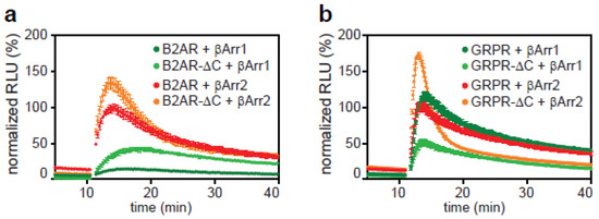 β-arrestin-1 binding showed receptor-specific effects: in the case of the B2AR, binding to the C-tail deficient variant was increased compared to full-length receptor during the duration of the assay, while for the GRPR, β-arrestin-1 binding to the truncated version was reduced (Figure 4a,b). This suggests that the C-tail of B2AR prevents β-arrestin-1 recruitment and that this inhibitory function plays a role in the arrestin specificity of class A GPCRs. For GRPR, a class B GPCR, the reduced binding points to an important contribution of the C-tail for β-arrestin-1 recruitment, suggesting a more equal contribution of both binding sites.