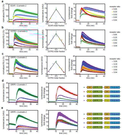 Gene dosage experiments were performed to test how the expression levels of the individual binding partners affect arrestin recruitment. We varied expression levels of both GPCR-11S and 114-β-arrestin-2 fusion proteins by transfecting different ratios of plasmids encoding β-arrestin-2 or receptor. The total amount of DNA was kept constant. We observed that the baseline of each GPCR/arrestin complex prior to stimulation depends on expression level ratios (Figure 5a–c, left column). A Job plot was created by plotting the baseline luminescence of all conditions against the fraction of receptor-encoding plasmid used. The highest baseline was observed in the case of a 1-to-1 mixture of plasmids. Two linear fits are shown in each Job plot, each fitted to all values either below or above the GPCR fraction of 0.5. A high binding affinity would cause a nonlinear, flattened curve [45]. The strong linear trends observed indicate a low affinity of β-arrestin-2 binding to the inactive receptors and of the attached luciferase subunits to one another. The low affinity of the 11S to the 114 subunits has been reported previously [29].