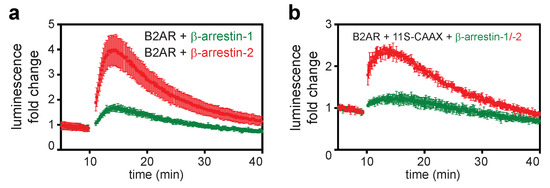To further validate the direct assay, we compared the recruitment efficacies of different β-arrestin-2 mutants to the B2AR in the direct assay and a classical BRET-based approach and compared the results obtained from both assays. The function of these arrestin mutants was described before [34,35]. No significant difference between the results of the two assays could be observed, providing evidence that the direct assay reports accurate measurements for relative binding strength (Figure 3b). All assay types lead to similar results, suggesting that they really measure the GPCR–arrestin interaction and not artifacts of the detection system.