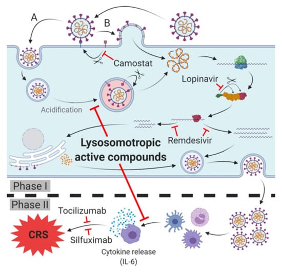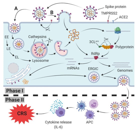 SARS-CoV(-2) host cell infection, replication (Phase I) and induction of immune response (Phase II). Spike protein (S protein) of SARS-CoV-2 binds to host cell membrane presented ACE2 (cellular receptor); it either enters the endocytic pathway (A) or fuses via TMPRSS2-mediated cleavage of the ACE2-S protein complex directly with the cell membrane (B). Traveling down the endosomal pathway, the maturation of early endosomes (EE), via late endosomes (LE) to early lysosomes (EL), and finally lysosomes, is accompanied by vacuolar acidification (indicated as red area). In late endosomes/lysosomes, the ACE2-S protein complex is cleaved via cathepsin L, resulting in the fusion of the viral and host cell membrane. After release into the cytoplasm, translation of viral RNA into the polyprotein takes place. Afterwards, the polyprotein is cleaved into several active non-structural proteins by the chymotrypsin-like protease subunit (3CLpro), including RNA depending RNA polymerase (RdRp). RdRp subsequently synthesizes progeny genomes and subgenomic mRNAs translated to structural proteins at the endoplasmatic reticulum. Both structural proteins and progeny genomes meet in the endoplasmic reticulum-Golgi intermediate compartment (ERGIC), resulting in the assembled SARS-CoV-2 virus. Finally, the nucleocapsid is released from host cell via exocytosis. In Phase II, SARS-CoV-2 is recognized and internalized by antigen presenting cells (APC), triggering an innate immune response which is accompanied by a release of cytokines, including Interleukin-6 (IL-6). In severe cases, a massive release of IL-6 leads to the cytokine release syndrome (CRS).