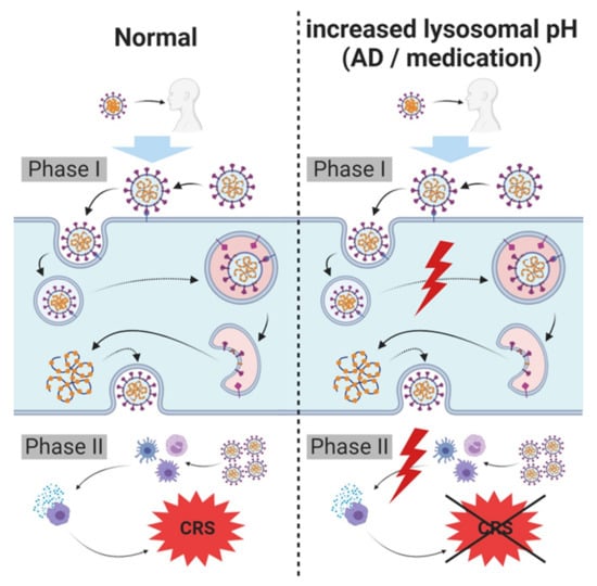 Lysosomotropism is a commonly occurring and often neglected biological characteristic of small molecules leading to accumulation in lysosomes, which is present in addition to their intrinsic receptor-mediated or enzymatic pharmacological effects. Regardless of the medical indications for which they have been used, many (active) compounds possess lysosomotropic characteristics [,,,,,,]. Therefore, they are potential active compounds for the treatment of SARS-CoV-2 viral infection of airway epithelial cells (type II pneumocytes), such as chloroquine in Sindbis virus infection []. Lysosomotropism is not unique to a particular type of cell; it affects all bronchoalveolar cells (including macrophages, dendritic cells, and granulocytes).