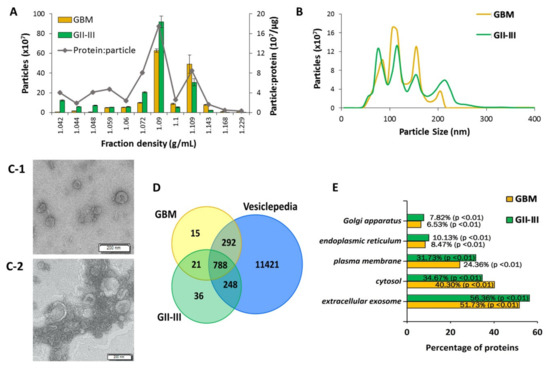Characterization of extracellular vesicles (EVs) isolated from glioblastoma (GBM) and astrocytoma GII-III surgical aspirates. EVs isolated from cavitron ultrasonic surgical aspirate (CUSA) washings from astrocytoma II-IV patients were enriched on OptiPrepTM density gradients. Nanoparticle tracking determined (A) particle numbers measured in each of the 12 density fractions collected (error bars indicate the standard error of the mean) and average particle to protein ratio and (B) size distributions of enriched GBM and GII-III CUSA-EVs in combined fractions 7–9. (C-1) Transmission electron microscopy (TEM) was used to visualize enriched CUSA-EVs from GBM and (C-2) astrocytoma grade II surgeries, scale bar = 200 nm. (D) Overlap of liquid chromatography tandem mass spectrometry (LC-MS/MS) sequenced proteins confidently identified in at least 80% of GBM (yellow) and GII-III (green) CUSA-EVs with proteins listed in Vesiclepedia (blue) associated with ‘extracellular vesicle,’ ‘exosome,’ ‘microparticle’ and ‘microvesicle.’ (E) FunRich annotations of GBM and GII-III CUSA-EV proteins to cellular compartments.