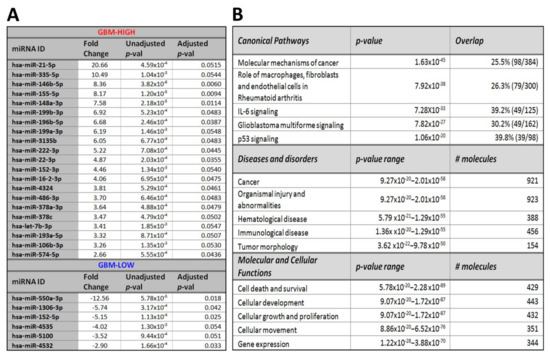 Significant miRNA species in GBM relative to astrocytoma GII-III CUSA-EVs. (A) Significant differential-expression (DE) miRNAs in enriched CUSA-EVs captured during astrocytoma debulking surgeries. miRNAs with significantly high (GBM-high; (FC ≥ 2, B-H adj. p ≤ 0.05) and low (GBM-low; FC ≤ −2, B-H adj. p ≤ 0.05) expression in GBM relative to GII-III CUSA-EVs are listed. (B) Functional pathway analysis of mRNAs targeted by 212 changing miRNAs (p ≤ 0.05) in GBM CUSA-EVs. The top canonical pathways, diseases and disorders and molecular and cellular functions are listed with the number of overlapping molecules and significance associations (right-tailed Fisher exact test, p-value).