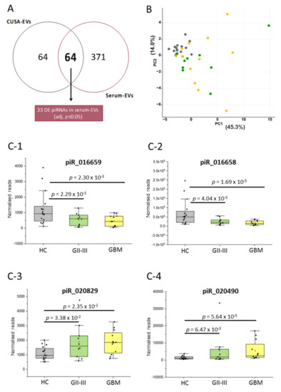 Four piRNA species (piR_016658, 016659, 020829 and 20490) with significantly higher expression in GBM CUSA EVs relative to GII-III (adj. p ≤ 0.05, Table 1) also changed between glioma and HC sera (p ≤ 0.05; GBM vs. HC and GII-III vs. HC; Figure 4A). This included piRNA species, 016658, 016659 and 020829 with strikingly higher expression levels (10.6-23.7-fold in GBM CUSA-EVs; Table 1). The distribution of piR_016658, 016659, 020829 and 20490 expression across the serum-EV samples are visualized in box plots (Figure 4C). While piR_016658, 015569, 020829 and 20490 had significantly higher expression in GBM relative to GII-III CUSA-EVs, piR_020829 and 020490 displayed higher levels and piR_016658 and 015569 lower levels in GBM and GII-III sera-EVs, relative to the HCs (Table S2A). While these significant piRNA species could discriminate glioma sera-EVs from HCs, they were unable to distinguish the sera of more aggressive GBM patients from GII-III. This is further substantiated by the PCA analysis (Figure 4B) based on data from 33 overlapping DE piRNA species across CUSA and serum-EVs, where GBM and GII-III samples could not be distinguished based on their piRNA expression. While there were no significant distinguishing piRNA species identified between GBM and GII-III serum-EVs, a trend was observed between the magnitude of piR_016658 and piR_016659 changes and glioma severity (Figure 4C-1,C-2); where HCs showed the highest expressions of piR_016658 (Figure 4C-2) and piR_016659 (Figure 4C-1), reduced levels were measured in GII-III patients and greater reductions observed in the GBM cohort.