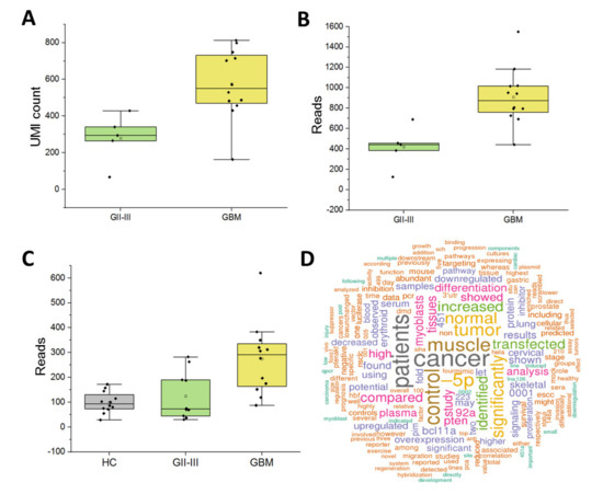 Encouragingly, 14 of the 27 DE miRNAs between GBM and GII-III CUSA-EVs (adj. p ≤ 0.05, Figure 2A) were also significantly expressed in serum-EVs (p ≤ 0.05; Figure 3C). These significant overlapping miRNAs included previously reported DE miRNAs in serum-EVs from GBM, GII-III and corresponding age- and gender-matched HCs (adj. p ≤ 0.05; 106b-3p, 378a-3p, 21-5p, 486-3p) [18]. Overlapping miRNAs with borderline significance in GBM CUSA-EVs relative to GII-III included miR-335-3p, 134-5p, 370-3p, 185-5p, 25-3p, 409-3p and 382-5p (0.05 ≤ adj. p ≤ 0.1;). Analogous expression of miR-486-3p in CUSA (Figure 5A,B) and serum-EVs (Figure 5C) was observed, with higher levels in GBM, relative to GII-III. An miRBase word cloud [62] was generated for hsa-miR-486 and lists functional information extracted from 182 open access papers and 1080 associated sentences (Figure 5D). Prominent keywords include ‘cancer,’ ‘increased’ and ‘plasma’ as well as ‘staging,’ ‘survival’ and ‘prognosis’ (Figure 5D). Interestingly, miR-106b-3p and miR-378a-3p were both more abundant in GBM CUSA-EVs relative to GII-III, however, in serum, these species were significantly higher in both GBM and GII-III serum-EVs relative to HCs (Figure 3C).