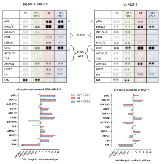 Data of a human phospho-kinase proteome profiler array of MDA-MB-231 (a) and MCF-7 (b) human breast cancer cells. The impact of collagen type 1 (COL1, green), as well as the absence (knockdown, kd) of ITGB1 (red) and COL1 binding in the absence of β1-integrins (blue) in reference to wildtype (wt) cells (black, basis line = 1). The intensities of the phosphorylated kinases were derived by pixel density analysis of the respective arrays shown above and are outlined in a log2 manner (n = 1). Highlighted are both main survival pathways mitogen-activated protein kinase (MAPK) and phosphoinositide 3-kinase/protein kinase B (PI3K/AKT).