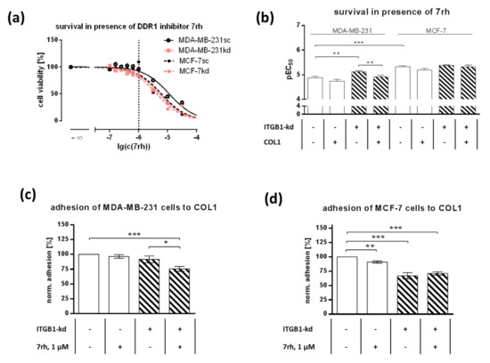 (a) Representative survival curves of MDA-MB-231 and MCF-7 cells (scrambled, sc) and their integrin β1-knockdown (ITGB1-kd) mutants on collagen type 1 (COL1) in the presence of DDR1-inhibitor 7rh for 72 h. The nontoxic concentration of 1 µM, used for adhesion studies in (c,d) is marked. (b) Statistical analysis of survival pEC50 of DDR1-inhibitor 7rh in MDA-MB-231 and MCF-7 scrambled and ITGB1-kd cells in the presence and absence of COL1. Data represent means ± SEM of at least n = 11 biological replicates. (c,d) Adhesion of MDA-MB-231 cells (c) and MCF-7 cells (d) and their ITGB1-kd mutants on COL1 in the presence or absence of DDR1-inhibitor 7rh. Data represent means ± SEM of n = 6 different biological replicates. Statistical analysis was performed via unpaired t-test (* p < 0.05; ** p < 0.01; *** p < 0.001).
