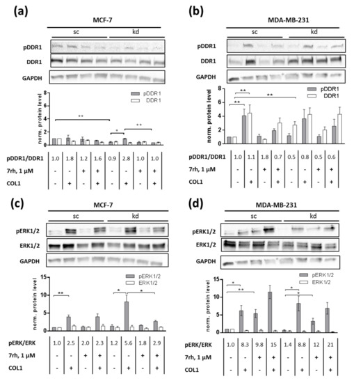 The presence of COL1 significantly increased pERK1/2 in MCF-7sc (p = 0.0058, Figure 3c) and MDA-MB-231sc (p = 0.0126, Figure 3d) cells. This COL1-mediated increase in MCF-7sc was not antagonized by 7rh. In contrast, in MCF-7kd cells, 7rh was able to reduce pERK1/2 significantly (p = 0.0444), which clearly indicates a MAPK activation due to DDR1 binding to COL1. For MDA-MB-231sc and MDA-MB-231kd cells, a correlation between DDR1 activity and ERK1/2 activation was not detectable. On the contrary, coincubation with 7rh significantly increased ERK1/2 phosphorylation eightfold in MDA-MB-231sc (p = 0.0089) and kd (p = 0.0238) cells. This indicated a potential escape strategy of MDA-MB-231 cells to cope with the DDR1 inhibition.