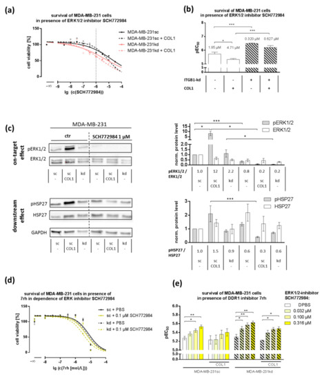 (a) Representative survival curves of MDA-MB-231 cells in the presence of ERK1/2-inhibitor SCH772984 for 72 h revealed a higher sensitivity of the integrin β1-knockdown (ITGB1-kd) cells towards ERK1/2-inhibition compared to scrambled (sc) cells and a higher resistance upon collagen type 1 (COL1) binding, indicated by the statistical analysis on these cytotoxicity data shown in (b) (n = at least 5 biological samples). (c) Western blot analysis of pERK/ERK and pHSP27/HSP27 with GAPDH as loading control after incubation with ERK1/2–inhibitor SCH772984 in MDA-MB-231 cells (n = at least 3 biological samples). (d,e) Combination effect of 7rh and SCH772984 cytotoxicity in MDA-MB-231 cells shows the pEC50 values of Discoidin Domain Receptor 1 (DDR1) inhibitor 7rh cytotoxicity in the dependence of SCH772984 (n = at least 3 biological samples). MDA-MB-231 cells display a significant increase in pEC50. Statistical analysis was performed via unpaired t-test (* p < 0.05; ** p < 0.01; *** p < 0.001).