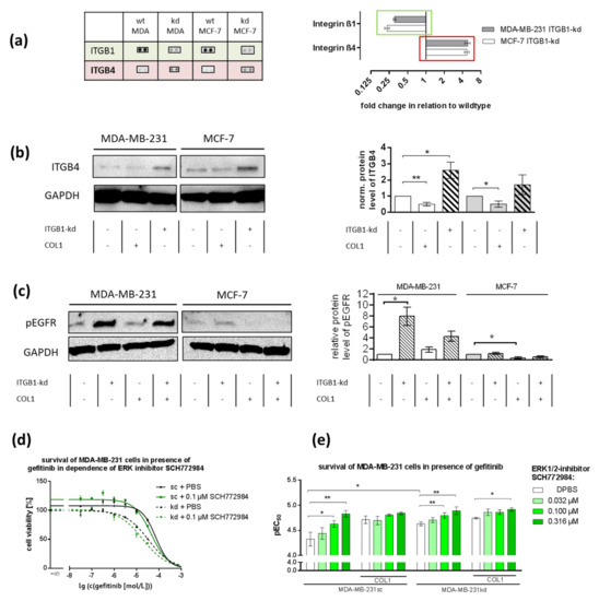 The role of EGFR in MCF-7 and MDA-MB-231 cells in COL1 induced cell activation affected by integrin β1-knockdown (ITGB1-kd). (a) Data of a surface receptor proteome profiler array indicate that the knockdown of ITGB1 (green) in MDA-MB 231 and MCF-7 cells was antagonized by the upregulation of integrin β4 (ITGB4, red) compared to wildtype (wt). (b) Western blot of ITGB4 in MCF-7 and MDA-MB-231 scrambled (sc) cells in dependence of collagen type 1 (COL1) or ITGB1-status (n = 3 biological samples). GAPDH was used as loading control. Data indicate that ITGB1-kd is associated with the upregulation of ITGB4. ITGB4 can form an active crosstalk to activate (c) pEGFR in MDA-MB-231kd, but only slightly in MCF-7kd cells (n = 3 biological samples). (d,e) Blocking of pEGFR by gefitinib was highly synergistic with ERK1/2-inhibition in MDA-MB-231 cells indicating a key role of EGFR in COL1-induced activation of MDA-MB-231 cells (n = at least 3 biological samples). Statistical analysis was performed via unpaired t-test (* p < 0.05; ** p < 0.01).