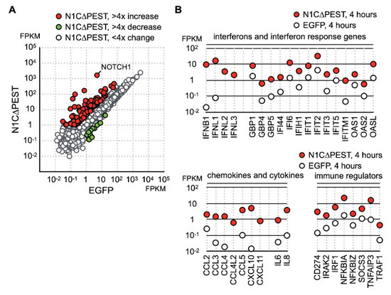 Identification of NOTCH1 activated genes in SW1353. (A) SW1353 was transfected with pEGFP-C1 and pEGFP-N1C∆PEST for 2 h and incubated in fresh medium for an additional 2 h. The cells were harvested for analyzation for gene expression by RNA sequencing. Genes with more than fourfold increase and decrease are colored red and green, respectively. Genes with less than fourfold change are colored gray. (B) NOTCH1-induced genes are grouped according to their functions as interferons, interferon response genes, cytokines, chemokines, and immune regulators.