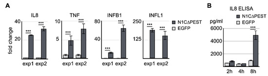 Confirmation of NOTCH1-activated genes by qRT-PCR and ELISA. (A) EGFP and EGFP-N1C∆PEST was transiently expressed in SW1353. Four hours after initiation of transfection, total RNA was extracted and analyzed for the expression levels of IL-8, TNF, IFNB1, and IFNL1 by qRT-PCR. Two independent experiments were carried out. The symbol of three asterisks indicates p-value smaller than 0.001. (B) Culture medium was collected 2 h, 4 h, and 8 h after transfection. The level of IL-8 in the medium was determined by ELISA.
