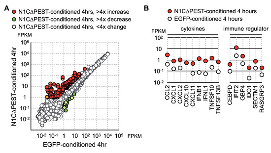 At four hours under conditioned medium, in the hFOB 1.19 cells treated with EGFP-conditioned medium, nine genes showed more than fourfold increase while nine genes showed more than fourfold decrease. In contrast, hFOB 1.19 incubated in N1C∆PEST-conditioned media had 28 upregulated genes and five downregulated genes with greater than fourfold changes (Figure 4A). Examination of the data showed that these genes induced by N1C∆PEST-conditioned media function in inflammation and immune regulation (Figure 4B).