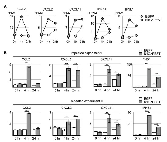 Activation of cytokine expression in osteoblast cell line hFOB by N1C∆PEST-transfected SW1353 conditioned medium. SW1353 was transfected with pEGFP-C1 or pEGFP-N1C∆PEST for 2 h and continued incubation in fresh medium for another 2 h. The culture medium was harvested and mixed with fresh medium in a 1:1 ratio. The osteoblast cell line hFOB was subsequently cultured in the conditioned medium. (A) After 0, 4, and 24 h, RNA was collected from conditioned hFOB and analyzed by RNA sequencing. The FPKM of CCL2, CXCL2, CXCL11, IFNB1, and IFNL1 in EGFP-conditioned and N1C∆PEST-conditioned hFOB at 0, 4, and 24 h was shown. (B) Two additional independent experiments were carried out. The expression level of CCL2, CXCL2, CXCL11, and IFNB1 was determined by qRT-PCR. GAPDH served as the control. The symbol of two and three asterisks indicates p-value smaller than 0.01 and 0.001, respectively.