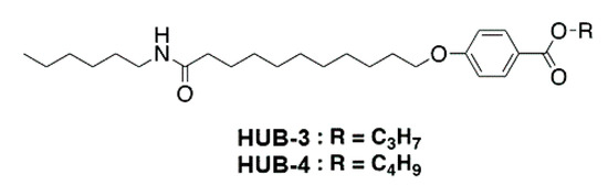 4-(11-hexylcarbamoyl-undecanoxy)-benzoic acid propyl ester (HUB-3): A solution of 4-hydroxybenzoic acid propyl ester (564 mg, 3.1 mmol) and K2CO3 (649 mg, 4.7 mmol) in DMF (90 mL) was stirred under N2 at 65 °C for 2 h. compound Am-HU (1.2 g, 3.5 mmol) was added and the mixture stirred for additional 8 h. The reactive mixture was poured into deionized water (300 mL), which resulted in the precipitation of a clear solid that was vacuum filtered and recrystallized from acetonitrile to afford pure HUB-3 as a white solid (998 mg, 71.2% yield): M. p. 60–62 °C; 1H NMR (400 MHz, CDCl3/TMS): δ (ppm) 0.88 (t, J = 6.8 Hz, 3 H, CH3), 1.02 (t, J = 7.4 Hz, 3 H, COO(CH2)2CH3), 1.29 (m, 16 H, CH2), 1.47 (m, 4 H, Ar–O(CH2)2CH2, NHCOCH2CH2), 1.62 (m, 2 H, CONHCH2CH2), 1.78 (m, 4 H, COOCH2CH2, Ar–OCH2CH2), 2.15 (t, J = 7.5 Hz, 2 H, NHCOCH2), 3.24 (q, J = 6.6 Hz, 2 H, CONHCH2), 4.00 (t, J = 6.6 Hz, 2 H, Ar–OCH2), 4.24 (t, J = 6.7 Hz, 2 H, COOCH2), 5.43 (s, 1 H, NH), 6.90 (d, J = 8.8 Hz, 2 H, ArC3–H, ArC5–H), 7.98 (d, J = 8.8 Hz, 2 H, C2–H, C6–H). 13C NMR (100 MHz, CDCl3/TMS) δ (ppm): 10.6 (COO(CH2)2CH3), 14.1 (CONH(CH2)5CH3), 22.2 (COOCH2CH2), 22.6 (CONH(CH2)4CH2), 25.9 (CONH(CH2)2CH2), 26.0 (NHCOCH2CH2), 26.6 (NHCO(CH2)2CH2), 29.1 (NHCO(CH2)3CH2), 29.33 (NHCO(CH2)4CH2), 29.36 (ArO(CH2)4CH2), 29.38 (ArO(CH2)3CH2), 29.4 (ArO(CH2)2CH2), 29.5 (Ar-OCH2CH2), 29.7 (CONHCH2CH2), 31.5 (CONH(CH2)3CH2), 37.0 (NHCOCH2), 39.5 (CONHCH2), 66.3 (COOCH2), 68.2 (Ar–OCH2), 114.0 (C3, C5, O–(Ar)CCH), 122.3 (Ar–C1), 131.5 (Ar–C2, Ar–C6), 162.9 (Ar–C4), 166.6 (COO), 173.1 (NHCO). GC/MS (ret. time, min) 36.64. FTIR (ATR-diamond) νmax (cm−1): 3304 (νN–H), 1710 (ester νC=O), 1634 (amide I), 1540 (amide II), 1251 (as νC–O–C), 1015 (sy νC–O–C), 1172 (ester as νC–O), 1106 (ester sy νC–O), 843, 767, 694 (oop Ar C–H). HRMS (ESI+): m/z 448.3435 [M + H]+ C27H45NO4 requires 448.3421. Analysis: found: C, 72.64; H, 10.15; N, 3.19; calculated for C27H45N O4: C, 72.44; H, 10.13; N, 3.13.