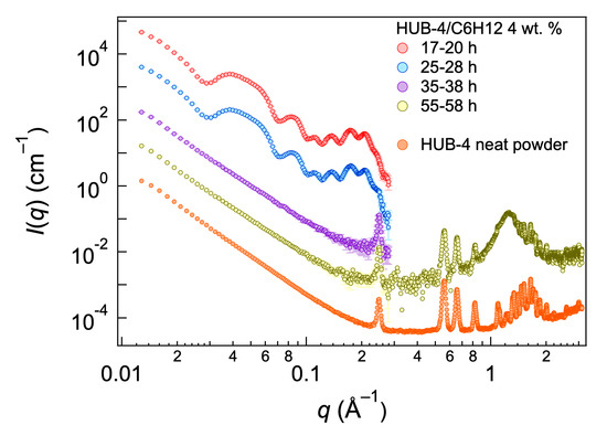 Small-angle X-ray scattering (SAXS) intensities of a HUB-4/C6H12 gel (c = 4 wt.%) at different times, and intensities of neat HUB-4. Between 38 and 55 h, the intensities are the same as the curve for the 35−38 h interval. For clarity, each curve is shifted from the previous one by a factor of 10.
