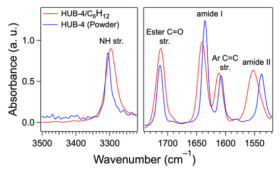 FTIR spectra of HUB-4/C6H12 (c = 4 wt.%) and pure HUB-4 (powder) in the NH and CO stretching area. In both samples the amide groups are H-bonded with each other, but with different H-bonds.