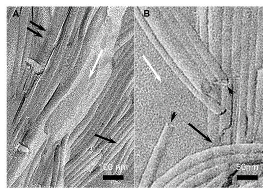 The structures of the gels were observed by TEM. The samples were processed by freeze fracture. The technique consists in a rapid freeze of the samples that kept them in the native state with the solvent amorphous [19,20,21]. It allows the observation of the structures in their surrounding solvent, without concentration change or drying effects. The gels of HUB-3 (Figure 4) were composed of high aspect ratio cylindrical objects with polydisperse diameters of 33.3 ± 9.5 nm. In some fractures, the ends of these objects were visible, and the shadowing clearly showed that they were hollow (Figure 4, arrow heads). The formed objects were not plain cylinders but tubes. Along with those objects, the gels contained less defined structures, including lamellar stacks with a repeat distance of 7−8 nm.