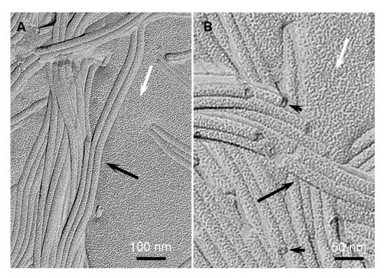 Freeze fractures of gels of HUB-4 in cyclohexane (2 wt.%). (A) large field view; (B) enlargement showing the end of tubes. Black arrows: tubes; arrow heads: ends of tubes; white arrows: amorphous solvent.