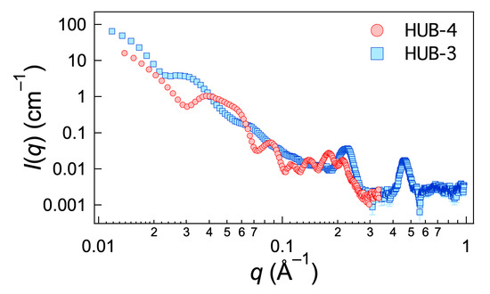 The gels of HUB-3 and HUB-4 were subjected to X-ray beam, and their scattered intensities measured between 0.01 Å−1 and 3 Å−1. The measured intensities are shown in Figure 6. The intensity scattered by HUB-4 had sharp features: two oscillations below 0.1 Å−1 and between 0.1 and 0.3 Å−1 a well-structured massif of 4 or 5 peaks.