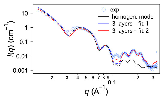 The model reproduces most of the features of the curve at low angles and at high angles, especially the shape of the first oscillations, and most of the oscillations above 0.1 Å−1 (Figure 7). The overall shape of the massif between 0.1 and 0.3 Å−1 can therefore be explained by a particular radial scattering length density profile resulting from a regular organization of the molecules within the walls of the tubes.