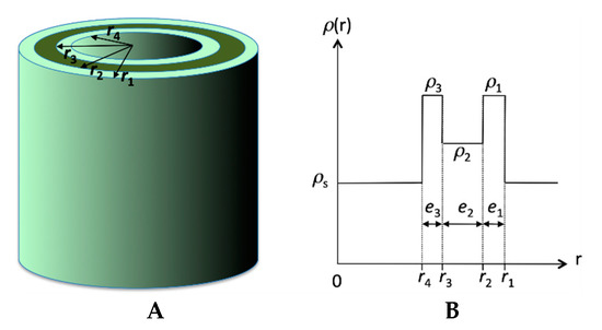 Model of tube with three layers. (A) definition of the different radiuses; (B) radial scattering length density profile ρ(r).