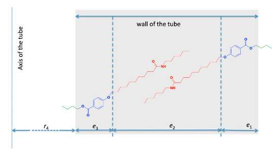 In the present case, the structured massif indicated a well-defined tube geometry and molecular organization. Therefore, we applied a form factor of tubes with an inhomogeneous scattering length density along the radial direction reflecting the regular molecular packing. The model was based on a three-shell organization within the wall of the tubes defining a radial scattering length density profile ρ(r) (Figure 8). The shells are numbered from 1 for the outer one to 3 for the inner one. ρn denotes the scattering length density of the nth layer, and en its thickness. ρs is the scattering length density of the solvent. rn is the outer radius of the nth shell and r4 is the inner radius of the tube. The thicknesses of the layers 1, 2 and 3 are e1 = r1 − r2, e2 = r2 − r3 and e3 = r3 − r4. The total thickness of the tube is e = e1 + e2 + e3, and the external radius of the tube is equal to r1 = e + r4.