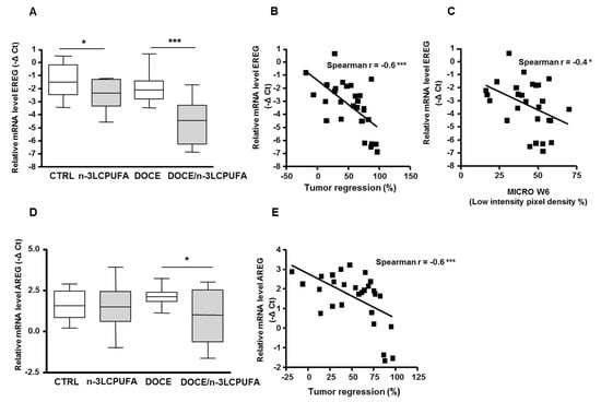 2.3. Epiregulin and Amphiregulin are New Molecular Targets of the n-3 LCPUFA-Enriched Diet, and Their mRNA Levels Correlate With Docetaxel Efficacy