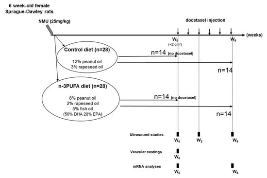 - Colas, S.; Mahéo, K.; Denis, F.; Goupille, C.; Hoinard, C.; Champeroux, P.; Tranquart, F.; Bougnoux, P. Sensitization by Dietary Docosahexaenoic Acid of Rat Mammary Carcinoma to Anthracycline: A Role for Tumor Vascularization. Clin. Cancer Res. 2006, 12, 5879–5886. [Google Scholar] [CrossRef]