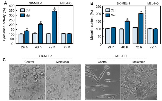 Effect of melatonin on melanogenesis in human melanoma cells SK-MEL-1 and MEL-HO. The cells were cultured in presence of 1 mM melatonin (Mel) for the time period indicated and tyrosinase activity (A) and melanin content (B) were determined and expressed as percentage of control. (C) The cells were cultured in presence of 1 mM melatonin for 72 h and visualized under phase contrast microscopy; original magnification 20×. * p < 0.05 vs. control (Ctrl).