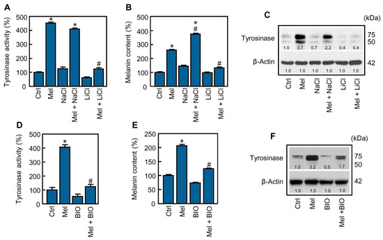 Effect of GSK-3 inhibitors on activation of melanogenesis by melatonin. (A–C) The cells were pre-incubated with 20 mM LiCl or 20 mM NaCl for 2 h and then treated with 1 mM melatonin (Mel) for 72 h. Tyrosinase activity (A) and melanin content (B) were determined and the values expressed as percentages of control. Tyrosinase levels (C) were analyzed by immunoblotting and β-actin was included as a loading control. (D–F) The cells were pre-incubated in absence or presence of 0.5 µM BIO for 2 h and then treated with or without 1 mM melatonin (Mel) for 72 h. Tyrosinase activity (D) and melanin content (E) were measured and the values expressed as percentages of control. The expression of tyrosinase (F) was determined by immunoblotting from lysates. * p < 0.05 vs. control (Ctrl); # p < 0.05 vs. melatonin treatment alone.