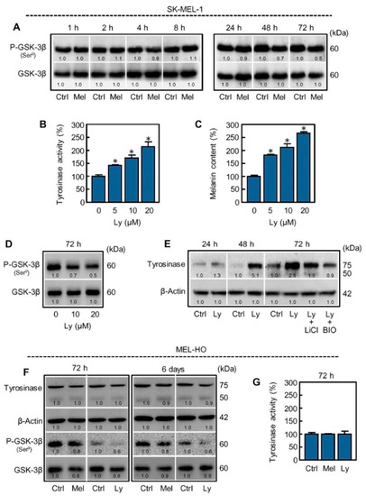 Melatonin reduces the levels of P-GSK-3β and Ly294002 mimics the effect of melatonin on melanogenesis in SK-MEL-1 cells. (A) The cells were incubated in presence of 1 mM melatonin (Mel) for the indicated period of time and P-GSK-3β was analyzed by immunoblotting. Membranes were stripped and reprobed with a total GSK-3β antibody as a loading control. (B,C) The cells were incubated with the specified concentrations of the PI3K inhibitor Ly294002 (Ly) for 72 h and tyrosinase activity and melanin content evaluated using a microplate reader. (D) The cells were treated with the indicated concentrations of Ly294002 (Ly) and P-GSK-3β was analyzed by immunoblotting. (E) The cells were pre-incubated in presence of 20 mM LiCl, or 0.5 µM BIO, for 2 h and then they were treated with 20 µM Ly294002 for the indicated period of time. Expression of tyrosinase was evaluated by immunoblotting and the level of β-actin was also measured as a loading control. (F) HO-MEL cells were incubated with 1 mM melatonin or 20 µM Ly294002 (Ly) for the indicated period of time and lysates were analyzed by immunoblotting. (G) The cells were treated as above and tyrosinase activity was determined using a microplate reader. * p < 0.05 vs. untreated cells.
