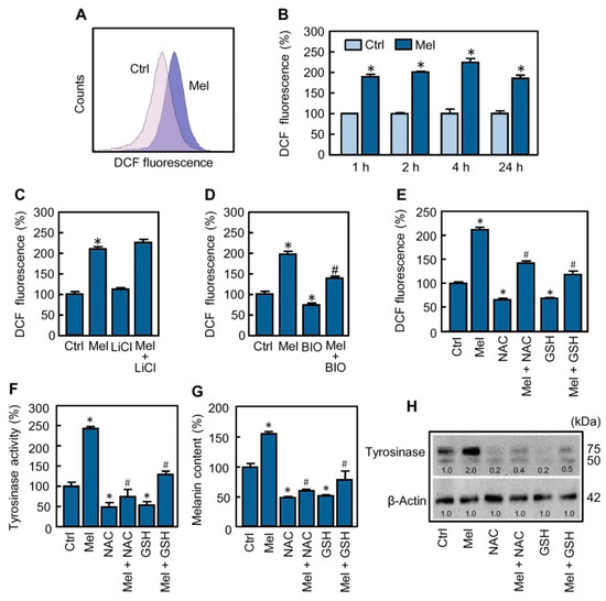 Reactive oxygen species are involved in melanogenesis stimulated by melatonin. (A) Cells were cultured with 1 mM melatonin (Mel) for 2 h, stained with H2-DCF and the fluorescence emitted by the oxidized fluorochrome was determined by flow cytometry; a representative histogram is shown. (B) Cells were treated with 1 mM melatonin for the time interval indicated and analyzed as above; mean fluorescence intensity from the resulting histograms was determined and the values are expressed as percentages of control. (C,D) Cells were pre-incubated with 20 mM LiCl, or 0.5 µM BIO, for 2 h and then they were treated with 1 mM melatonin for 4 h; DCF-derived fluorescence was determined as in (B). (E) The cells were pre-incubated with 5 mM NAC or GSH for 2 h and then treated with 1 mM melatonin for 4 h; relative ROS levels were determined by flow cytometry. (F–H) The cells were pre-treated with 5 mM NAC or GSH for 2 h and then treated with 1 mM melatonin for 72 h. Tyrosinase activity (F) and melanin content (G) were measured from lysates in a microplate reader. (H) Expression of tyrosinase was analyzed by immunoblotting and β-actin was included as a loading control. * p < 0.05 vs. the respective control; # p < 0.05 vs. melatonin treatment alone.
