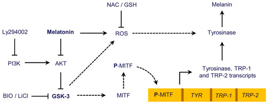 Phosphatidylinositol 3-kinase (PI3K)/AKT signaling is an important pathway for controlling melanogenesis and it is frequently found to be active in melanoma cells. In response to hormones and growth factors, the serine/threonine protein kinase AKT binds to PI3K phospholipid product phosphatidylinositol 3,4,5-trisphosphate on the plasma membrane where it is activated by phosphorylation on threonine 308 and serine 473 [17]. The properties of a wide range of proteins are sensitive to phosphorylation by AKT. A recognized target is GSK-3β, a protein serine/threonine kinase involved in cell signaling which is phosphorylated on serine 9 leading to its inactivation [18]. Herein, we demonstrate that melatonin upregulates the enzymes involved in melanogenesis in SK-MEL-1 and provide evidences that GSK-3β plays a central role. Moreover, although melatonin is known as a radical scavenger, reactive oxygen species seems to be involved in the melanogenic process since they are quickly stimulated by the indoleamine and melanogenesis is blocked by the use of antioxidants.